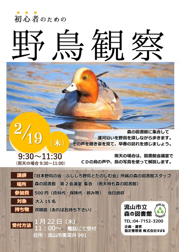 • 日本野鳥の会・ふじしろ野鳥と楽しむ会所属の図書館スタッフと、森の図書館から運河駅まで歩きながら野鳥を観察します。雨天時は室内で野鳥の写真を見ながら野鳥の話を聞きます。