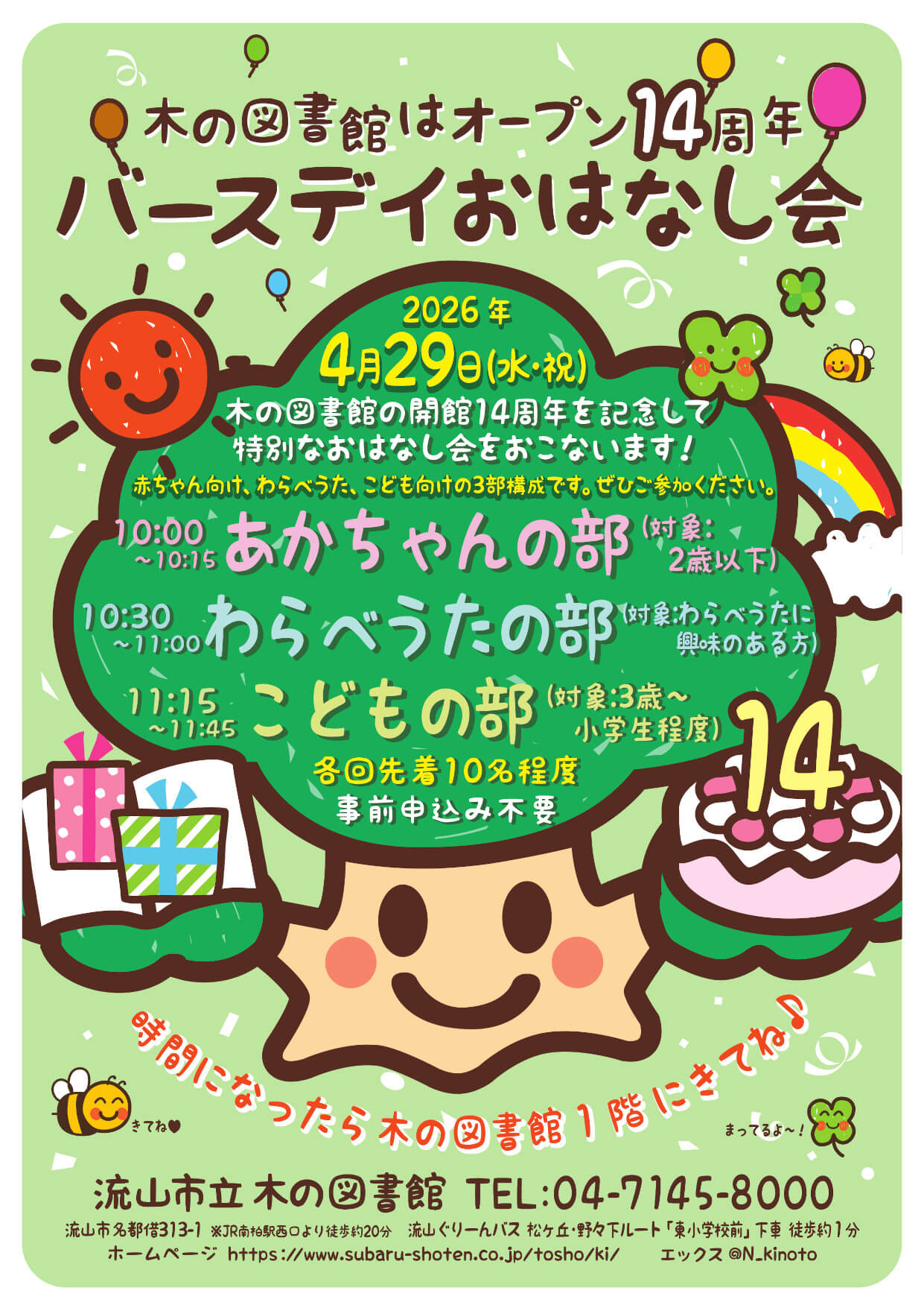 - 木の図書館の開館14周年を記念して、特別なおはなし会を行います。赤ちゃん向け、わらべうた、児童向けの3部構成で開催しますのでぜひ、ご参加ください。