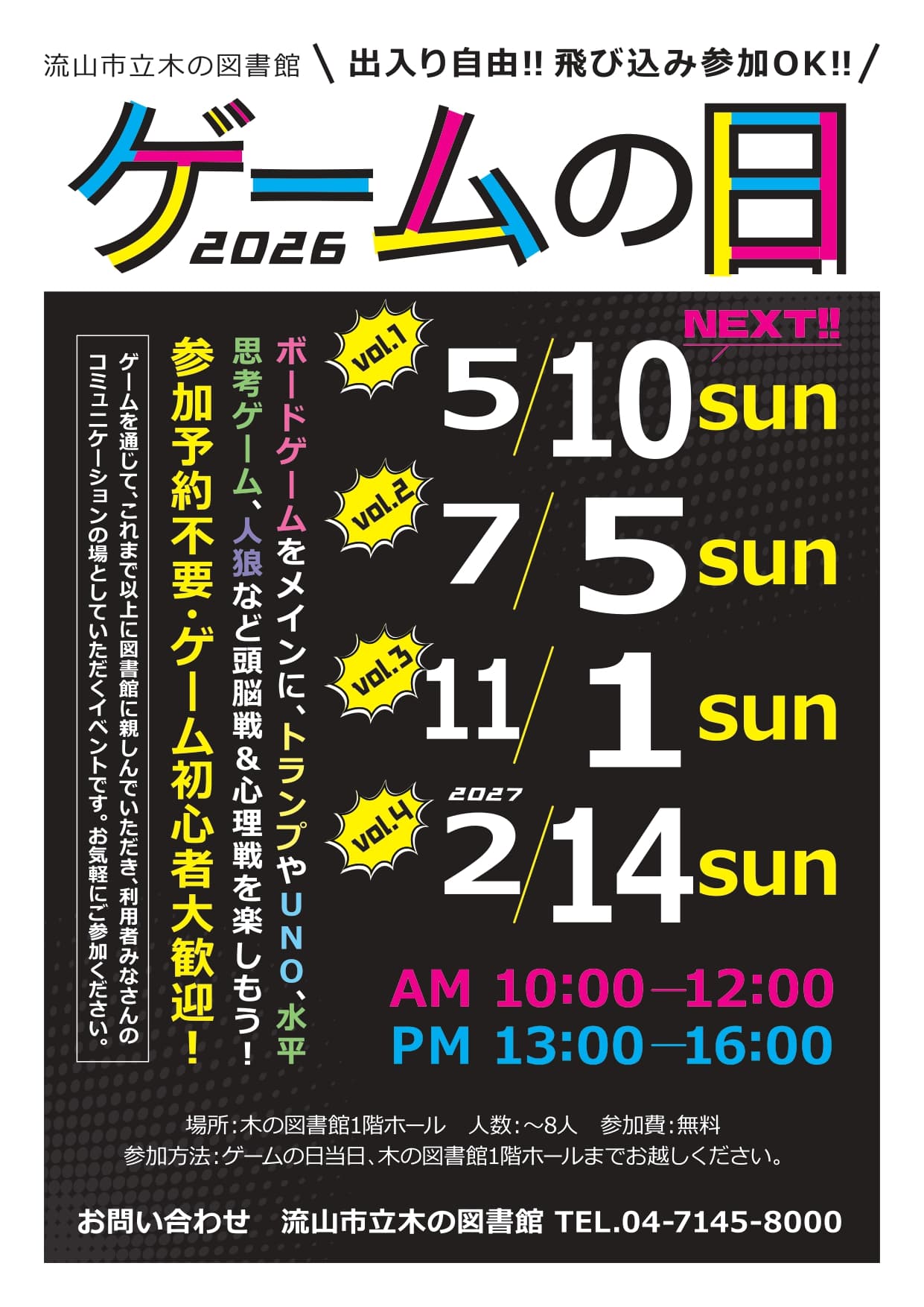 ※参加申し込みは不要です。ゲームの日当日、木の図書館1階ホールまでお越しください。