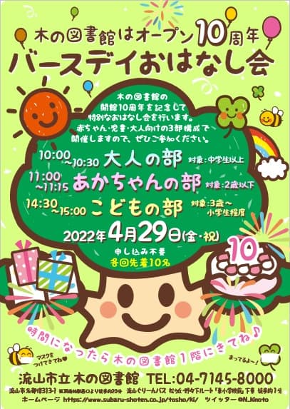 - 木の図書館の10歳のお誕生日を記念して、特別なおはなし会をおこないます!