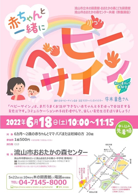 - 初めての方向けのベビーサイン体験会です。ベビーサインは、まだうまくお話ができない赤ちゃんと手を使って会話をする育児法です。コミュニケーションの手段を増やして、楽しい育児生活を送りましょう。