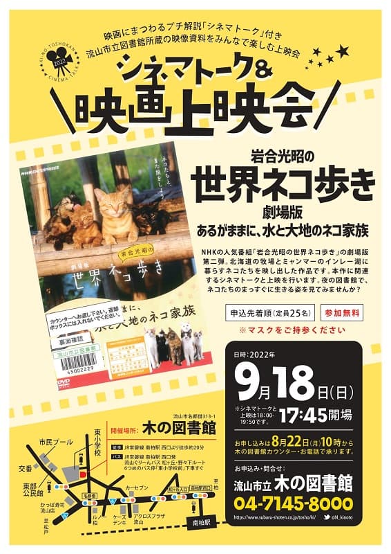 - 映画にまつわるプチ解説「シネマトーク」付きの、流山市立図書館所蔵の映像資料をみんなで楽しむ上映会です。