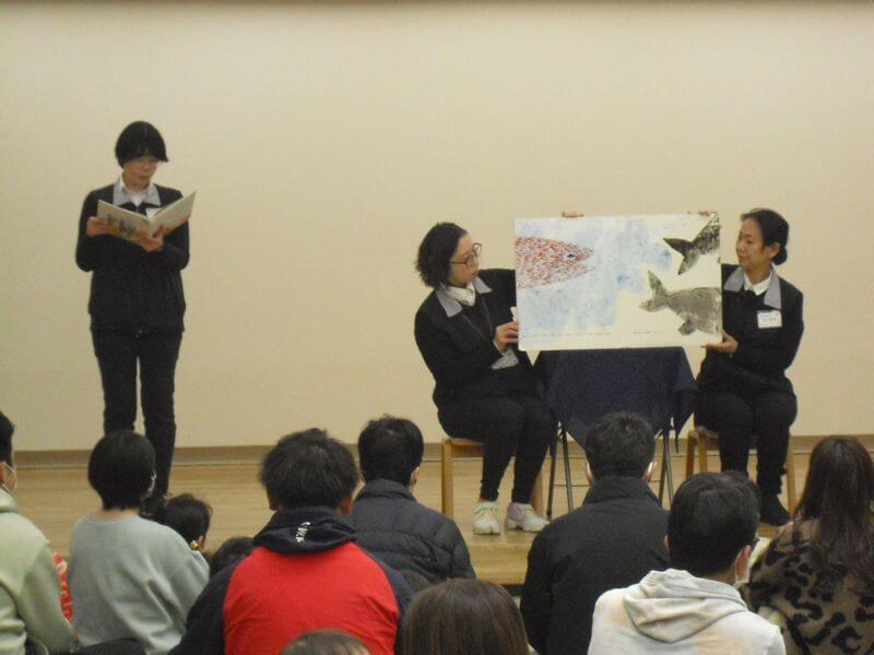 クリスマス特別バージョンの手遊びから始まり、大型絵本、紙芝居、「赤鼻のトナカイ」の歌も歌いました。
